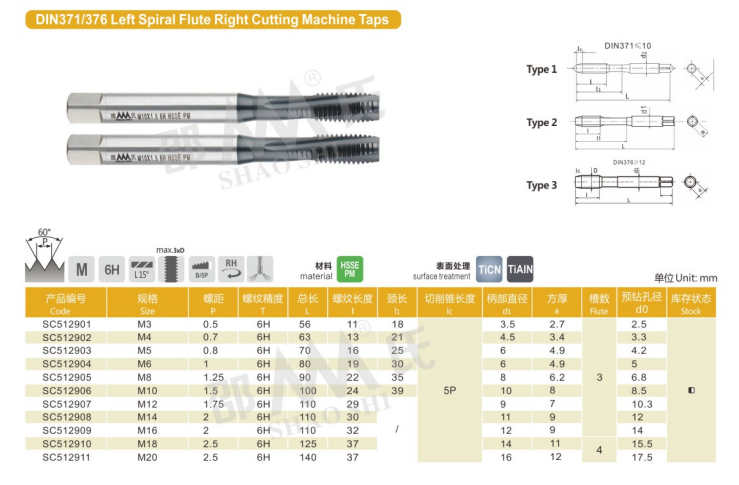 DIN371/376 Left Spiral Flute Right Cutting Machine Taps