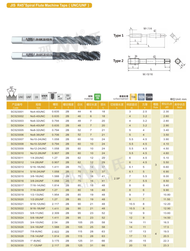 JIS R45°Spiral Flute Machine Taps(UNC/UNF)