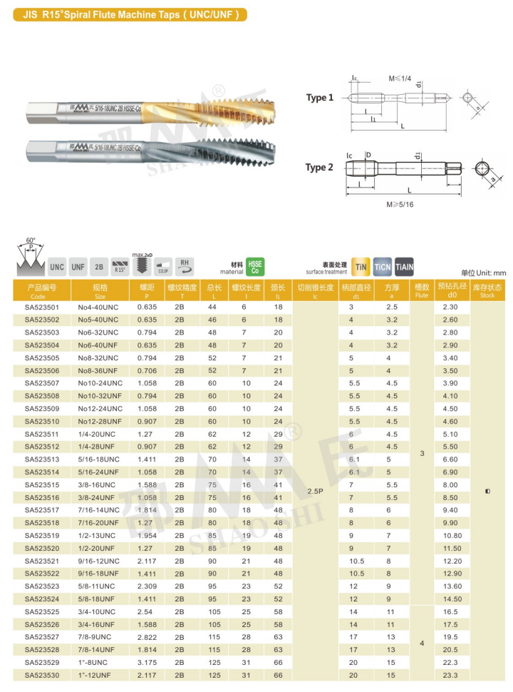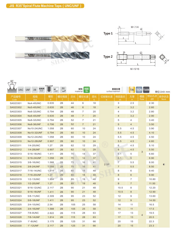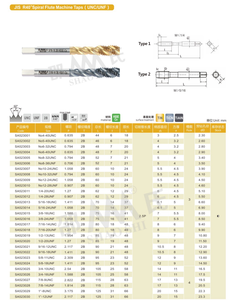 JIS R40°/35°/15° Spiral Flute Machine Taps(UNC/UNF)